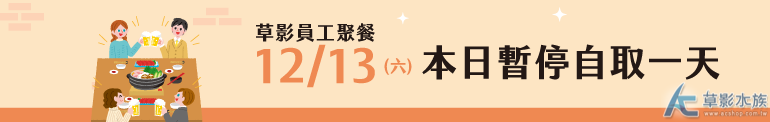 1. 因草影12/13(六)員工聚餐,自取服務暫停一天。