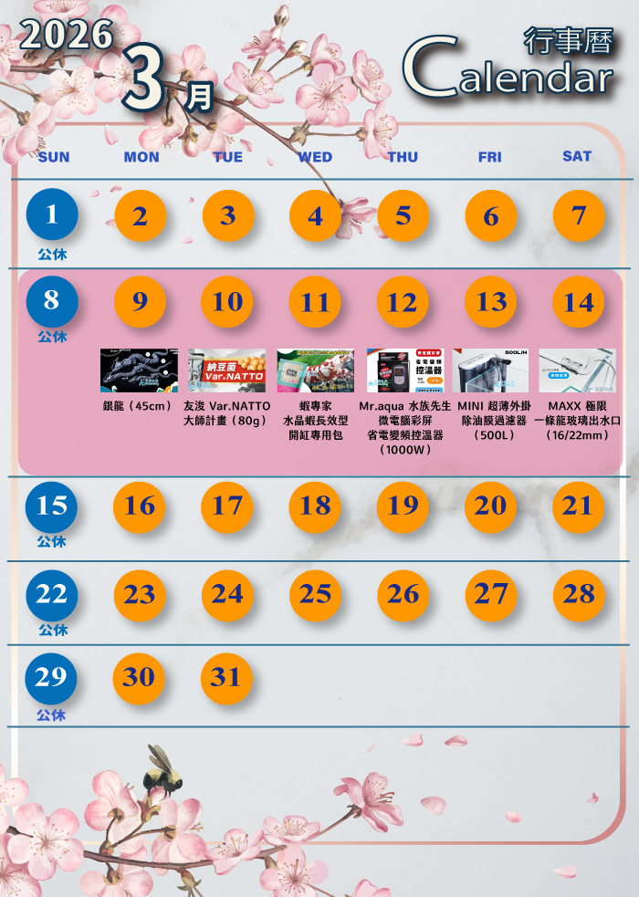 2. 每週行事曆上有各式各樣的優惠商品,公休日會推出配合的特殊贈品搭配贈送唷。