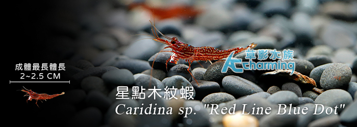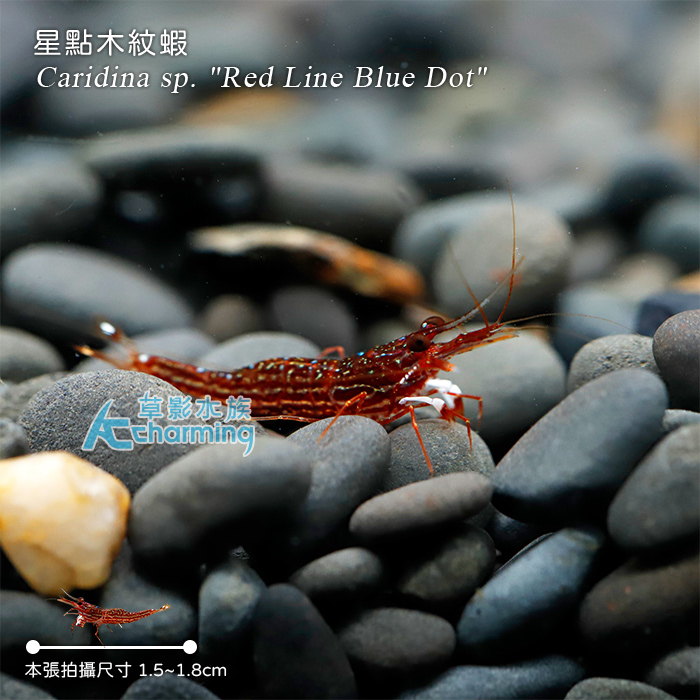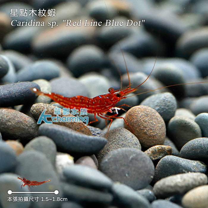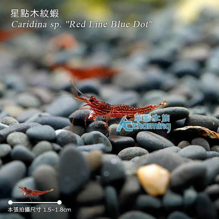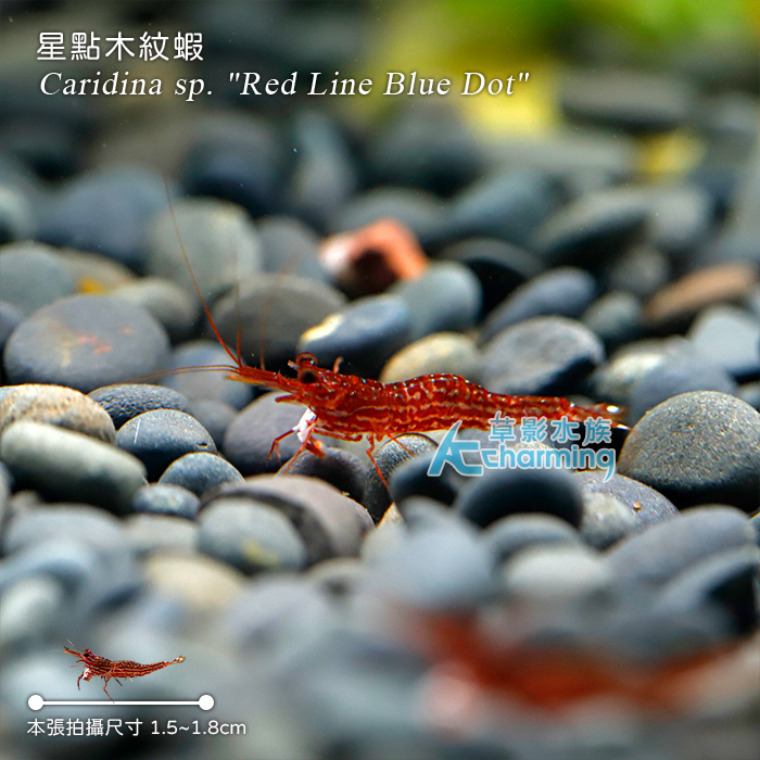 4. 如有活體死亡請於收件後60分鐘內拍照回傳,拍照需包含未拆封的原始魚袋完整包裝。[活體種源] 人工繁殖品種 [養殖難度] ★★ [PH] 7~8.5 [GH] 8~15 [KH] 10~15 [溫度] 25~31度 [單位數量] 一隻 [國際學名] Caridina sp. "Red Line Blue Dot"