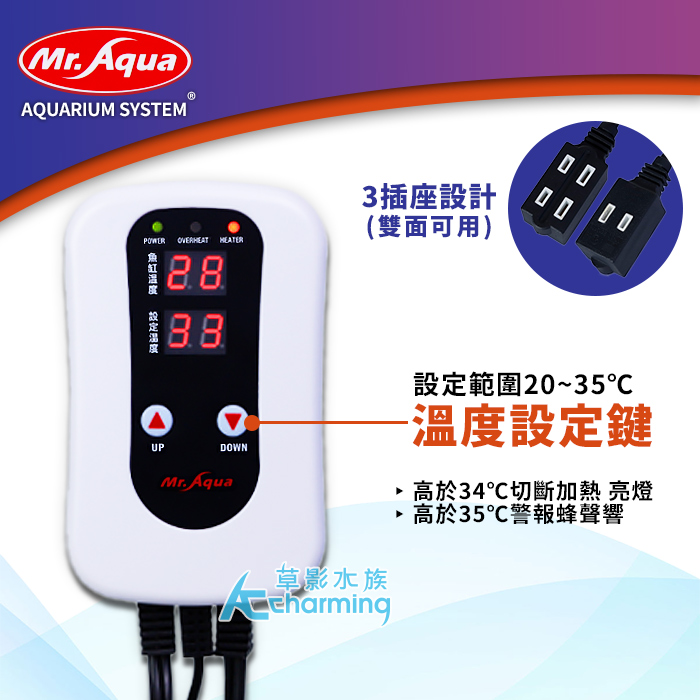 2. 水族專業用微電腦控溫器,建議設定溫度範圍:18~32℃;可從螢幕視窗看到目前水溫,簡單按鍵設定操作更方便。