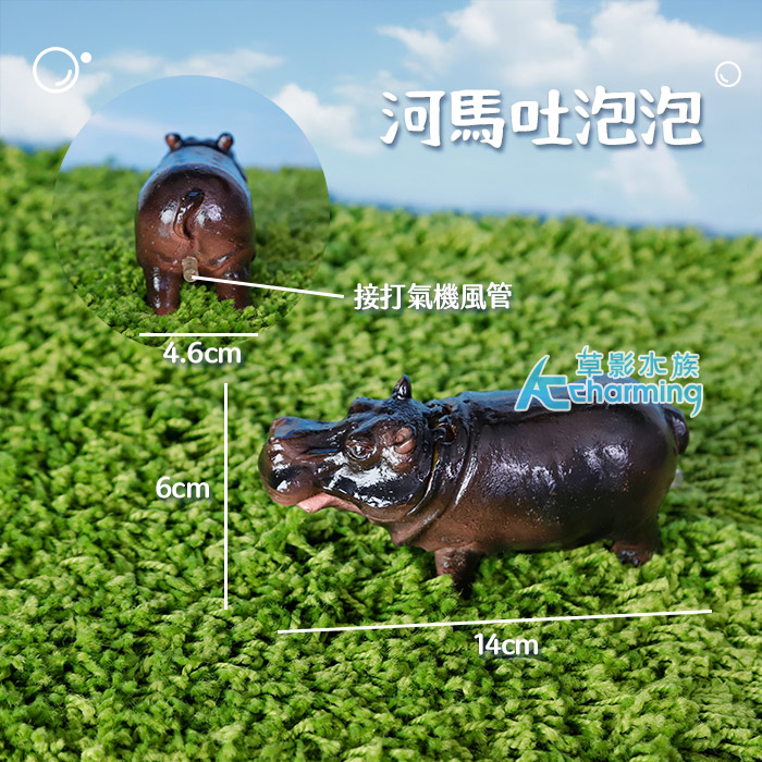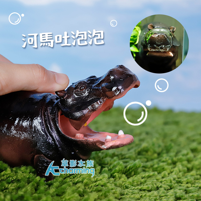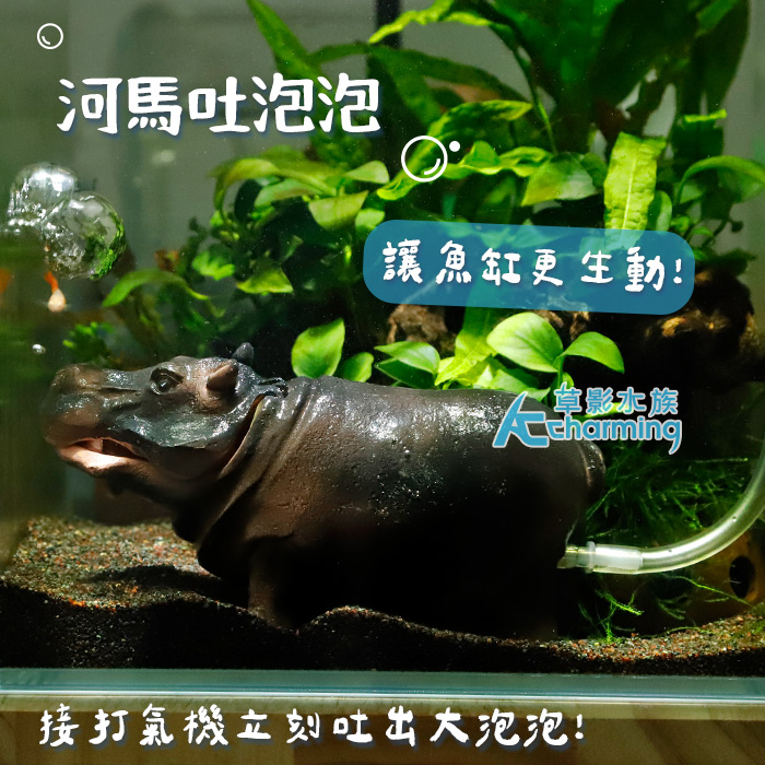 3. 需另配合打氣機使用,可帶動河馬嘴巴開合,隨著打氣機節奏開合增加溶氧效果,使魚缸生動活潑!