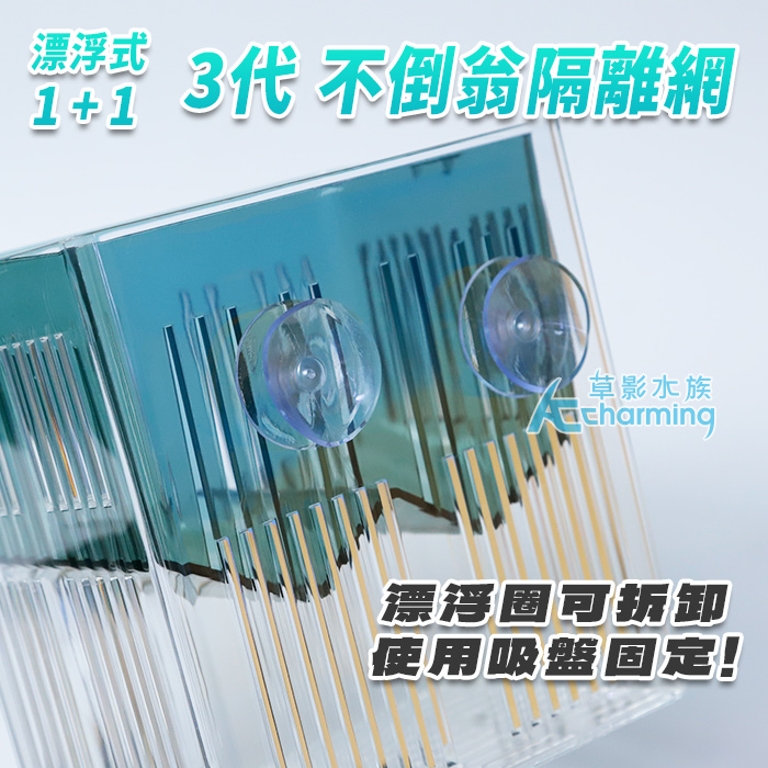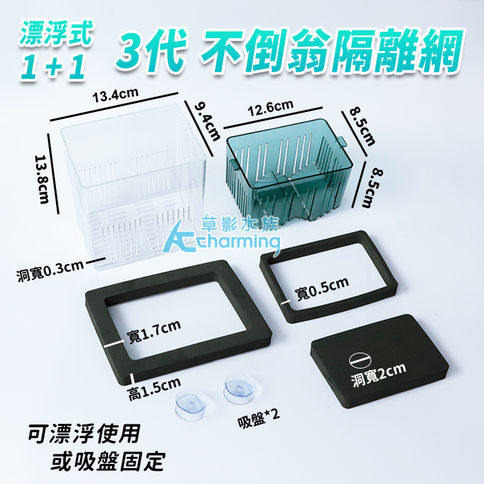 1. 3代升級不倒翁設計:底部V型導流結構,隔離盒在水中穩定不傾倒,幼魚不會被壓在角落。