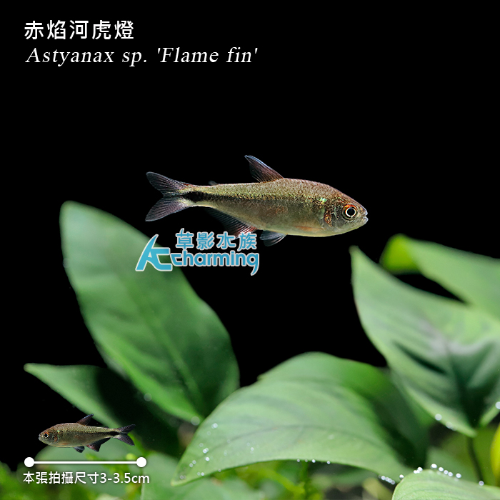 4. 如有活體死亡請於收件後60分鐘內拍照回傳,拍照需包含未拆封的原始魚袋完整包裝。[活體種源] 國外野生品種 [養殖難度] ★★ [PH] 5.8~7.5 [單位數量] 一隻 [國際學名] Astyanax sp. 'Flame fin'
