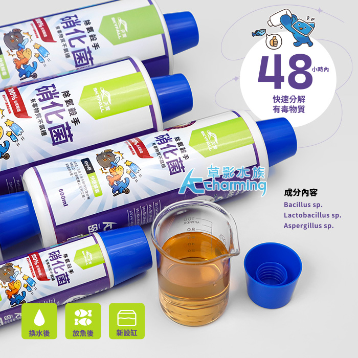 3. 48 小時內快速分解阿摩尼亞、亞硝酸鹽及硫化氫,維護健康水質。