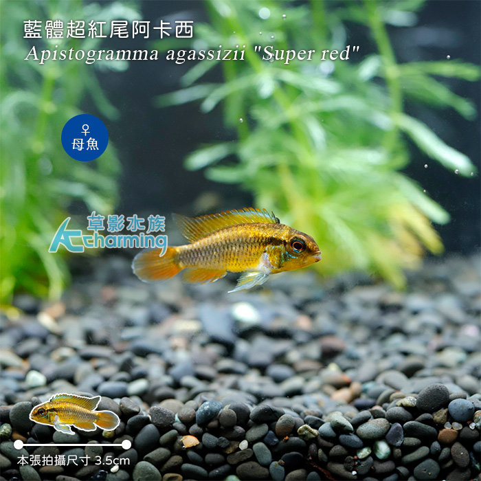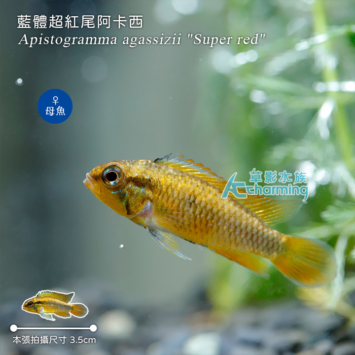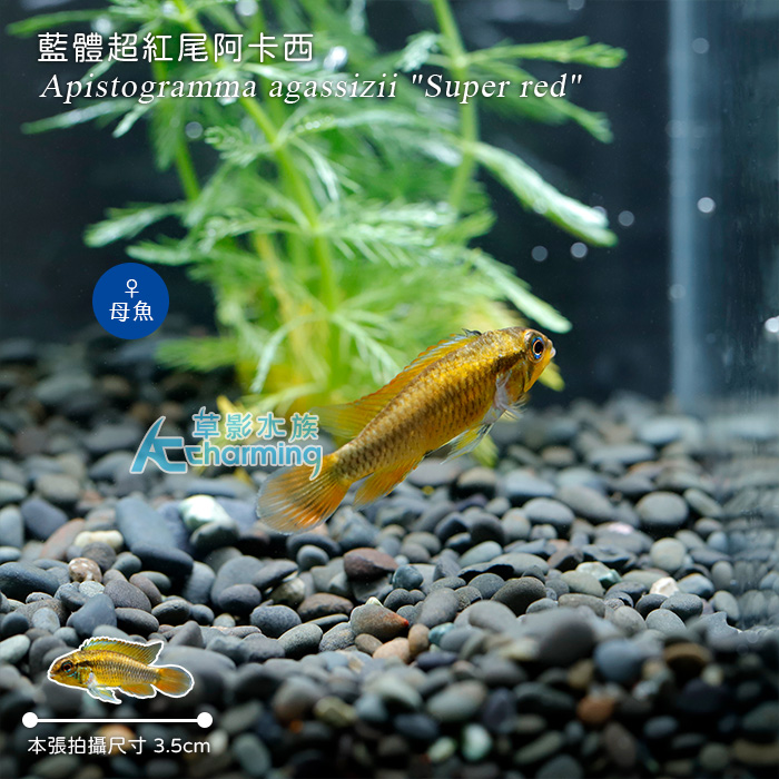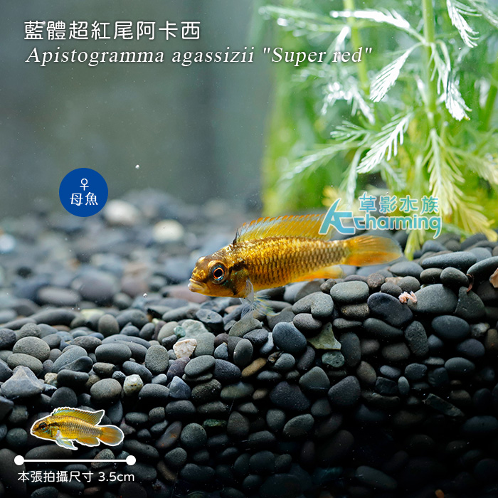 4. 如有活體死亡請於收件後60分鐘內拍照回傳,拍照需包含未拆封的原始魚袋完整包裝。[活體種源] 人工繁殖品種 [養殖難度] ★ [PH] 5.8~7.2 [GH] 0~12 [KH] 0~15 [溫度] 22~30度 [單位數量] 一對 [販賣大小] 公魚約3.5cm、母魚約2.5cm [國際學名] Apistogramma agassizii "Super red"