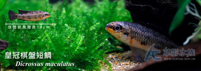 商品屬性 [國際學名] Dicrossus maculatus [養殖難度] ★★ [PH] 5.8~7.3 [GH] 0~8 [KH] 0~7 [溫度] 22~28度 [活體補償] 1. 魚蝦叨穩後出貨,如有運送途中造成死亡,當次死亡於下次訂購時補償,所有螺類部分均無提供補償。