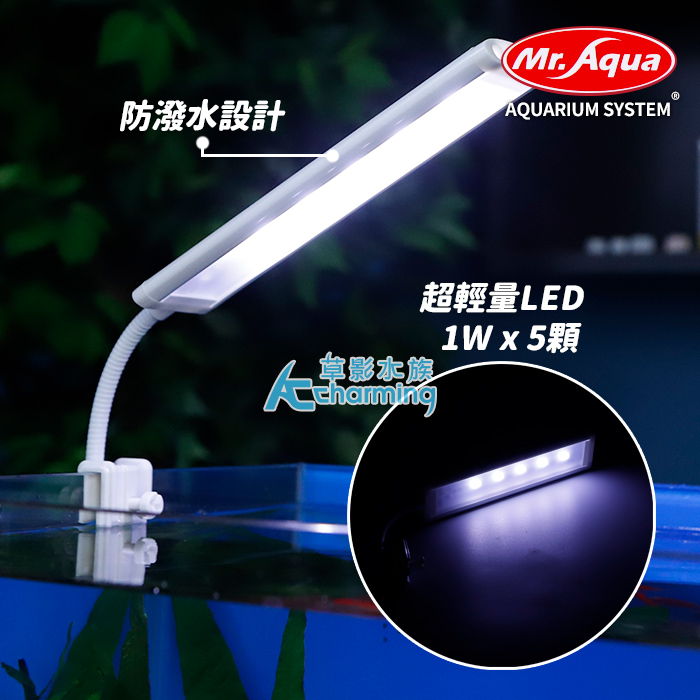 產品特色:1. 金屬外殼、薄型設計、超省電、通過最新安規認證。2. 長壽命的高亮度,蛇管設計可隨意調整光源角度。3. 提供水族箱生態之專業照明,使觀賞魚、水草色彩更加豔麗。4. 採用低電壓節能LED燈,使用上更安全、更節能省電。5. 提供最佳的照明,有利觀賞魚、水生植物及海洋珊瑚礁的生長。6. 發光效率高,光線集中,不含水銀等重金屬,低污染。7. 造型美觀、時尚,很適合搭配各型魚缸。