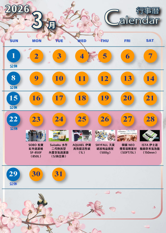 2. 每週行事曆上有各式各樣的優惠商品,公休日會推出配合的特殊贈品搭配贈送唷。