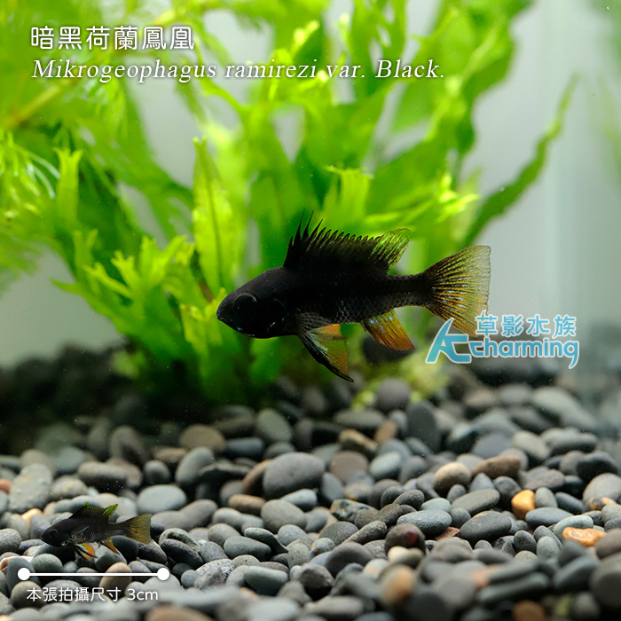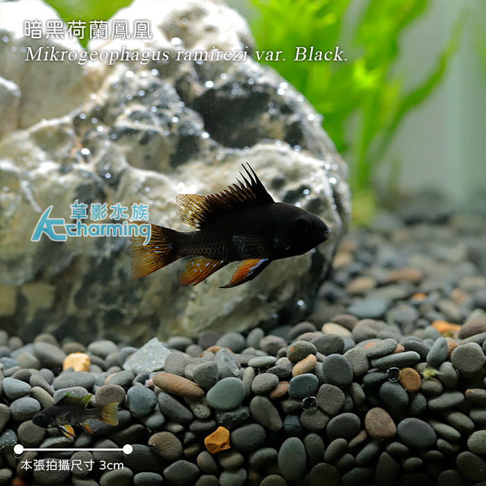 4. 如有活體死亡請於收件後60分鐘內拍照回傳,拍照需包含未拆封的原始魚袋完整包裝。[國際學名] Mikrogeophagus ramirezi var. Black [活體種源] 國外繁殖品種 [養殖難度] ★★ [單位數量] 一隻 [PH] 6.0~7.5 [GH] 0~8 [KH] 0~10 [溫度] 22~27度