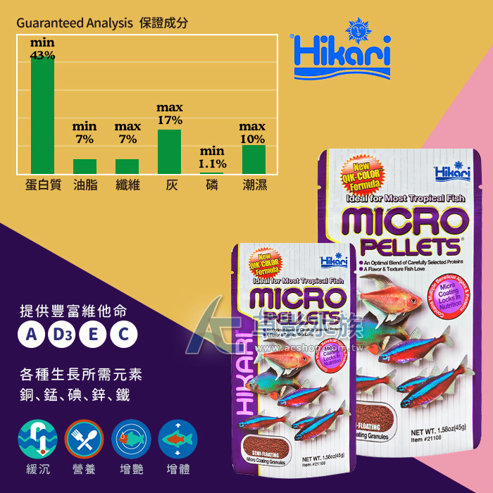 1. (豔)紅燈科魚微粒應用尖端生物技術生產,具有豐富的營養、形狀獨特的微粒飼料,還特別添加了天然增色成分,使您飼養的熱帶魚始終保持極其亮麗的色彩。