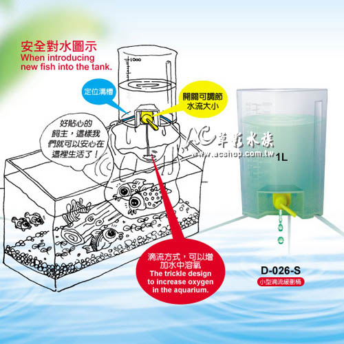 產品特色:1. 一般換新水時,新水加入過快,容易造成缸內水質、水溫、酸鹼值、導電度...等等的急速改變,也造成魚兒生理的緊迫性而生病或甚至死亡。2. 缸內下藥時,一般對魚隻也有刺激性及緊迫性而造成傷害,現在使用雅柏水質滴流緩衝器,可以在換水或下藥時讓這些傷害減到最低或甚至沒有,讓你缸內生態、魚兒保持在最佳狀態。3. 不僅適合於水族生物,對水質波動大的如太陽類的水草同樣適用,如像蝦缸加入蒙脫石、太古海泥等對水質有波動的產品時,也可使用滴流桶入缸。4. 免工具可直接架在魚缸角落,方便換水,側面刻度標示,可通過閥門控制出水量,使用簡單方便。