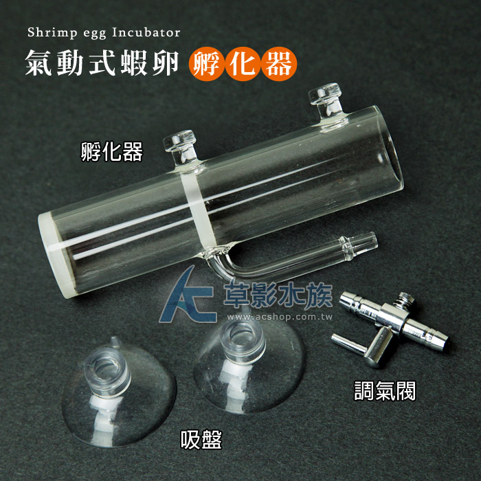1. 內容物:玻璃孵化器x1、調節閥x1、吸盤x2。