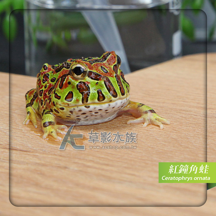 4. 如有活體死亡請於收件後60分鐘內拍照回傳,拍照需包含未拆封的原始魚袋完整包裝。[國際學名] Ceratophrys ornata [養殖難度] ★★ [貼心叮嚀] 明顯特徵是綠色體表與不規則紅斑,容易飼養,請適量餵食。每次餵食量勿超過體積的一半,建議3~7cm內(一星期餵食1~2次)、7cm以上(10~15天餵食1次),或有排糞便的當天再餵食也可。飼養環境:魚缸內放一塊水族用的生化棉,用礦泉水或是曝氣過後的自來水,水不要超過生化棉的厚度即可。小蛙要注意不可以在同一個箱子養兩隻,會互吃同類!建議餵食:PacmanFood 角蛙專用飼料(揚色型/100g)等等揚色類飼料。 [溫度] 25~29度 [販賣大小] 約3cm