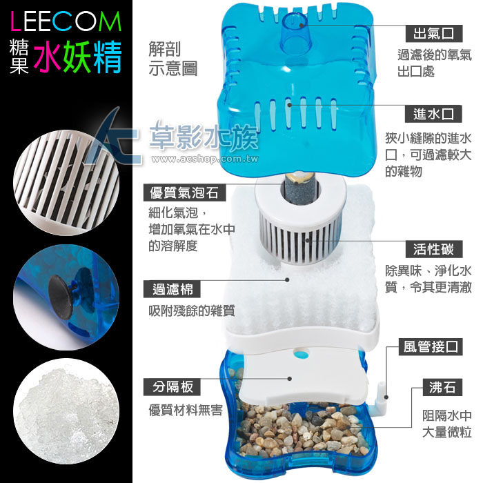 2. 結合打氣機使用,能提高水中的含氧量,達到增進溶氧量、生物過濾雙重功效,從而使水族箱的水質穩定清澈。