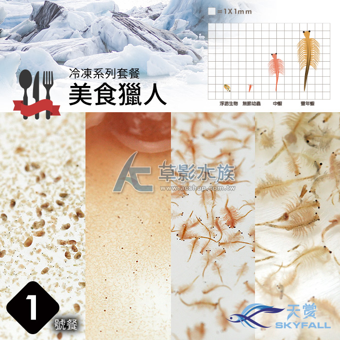 1. 內容:中蝦*2入、豐年蝦*1入、浮游生物*1入、無節幼蟲*1入,共5片裝。