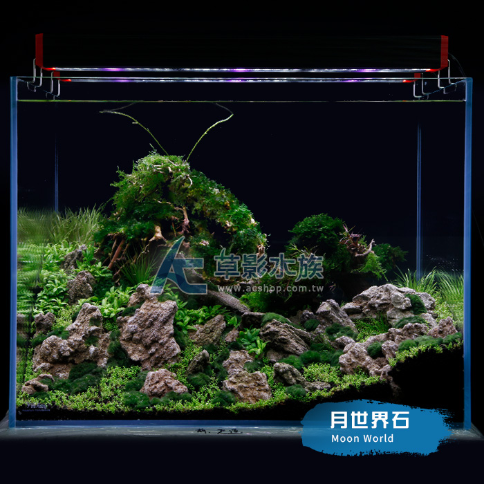 1. 月世界石適合與前景草與默思類搭配造景,利用強力膠以黏著方式讓水草附於石上,實顯意境深遠。