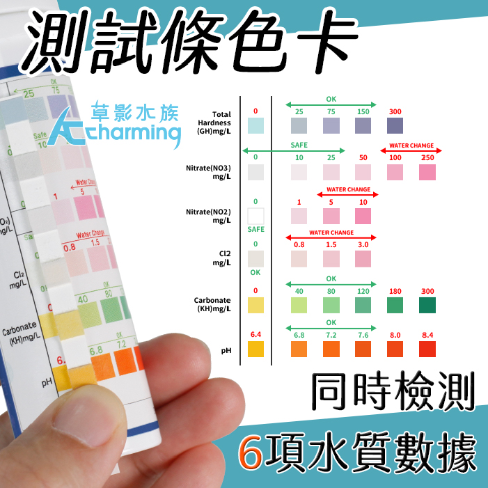 2. 快速檢測6種重要的水質數據,作為定性參考,硝酸鹽(NO3)和亞硝酸鹽(NO2)值表明生物淨化過程是否正常,碳酸鹽硬度(KH)穩定pH值來說非常重要,總硬度(GH)表示水中礦物質太多或太少,濃度超過0.02ppm時,對魚類黏膜產生強烈的腐蝕作用,超過0.1ppm時,對水中生物造成生命威脅,以及測CL2。